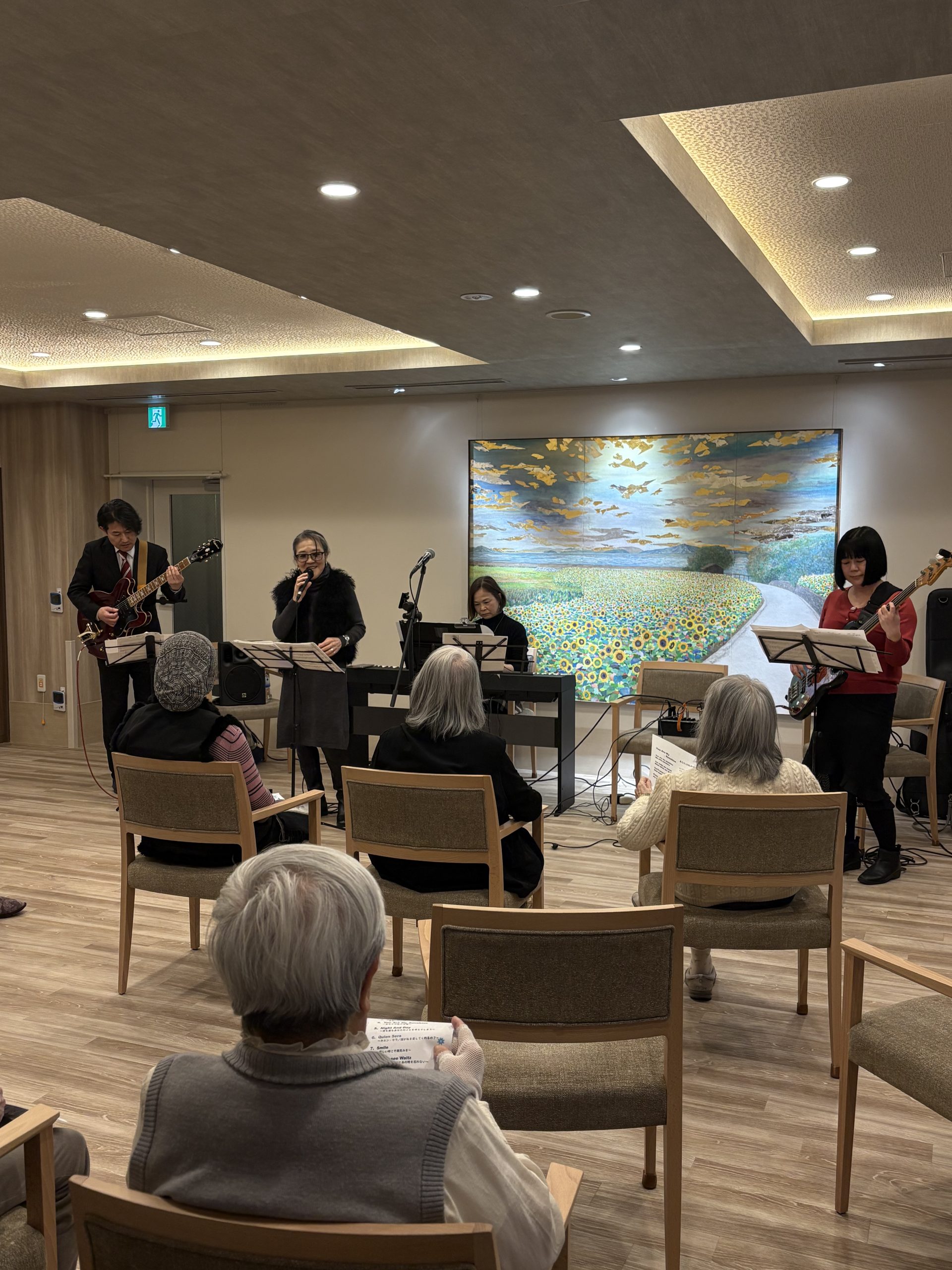こちらの介護付き有料老人ホームは開所して丁度2年ということで、2周年記念コンサートをご依頼いただきました。ピアノ/ギター/ベース+2ボーカルによってジャズの名曲を沢山お届けし楽しんで頂きました。また5月にも再演させて頂くことになりました。