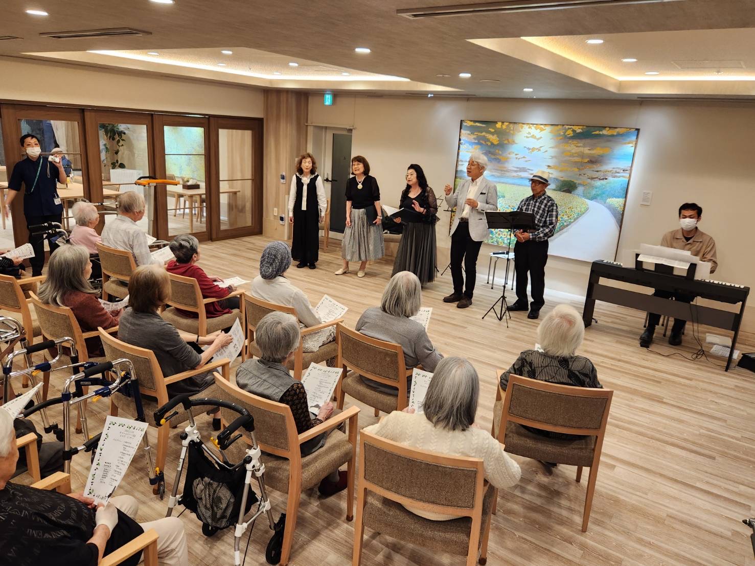 荻窪南の高級住宅街にたたずむチャームスイート荻窪さんで初夏のジャズコンサートを行いました。ジーン・ケリー張りのダンスを含めたSinging in the Rain、スイングジャズの代表曲Sing! Sing! Sing!、名作曲家 服部良一のヘイヘイブギなど、熟年コーラス隊の熱唱を楽しんで頂きました。