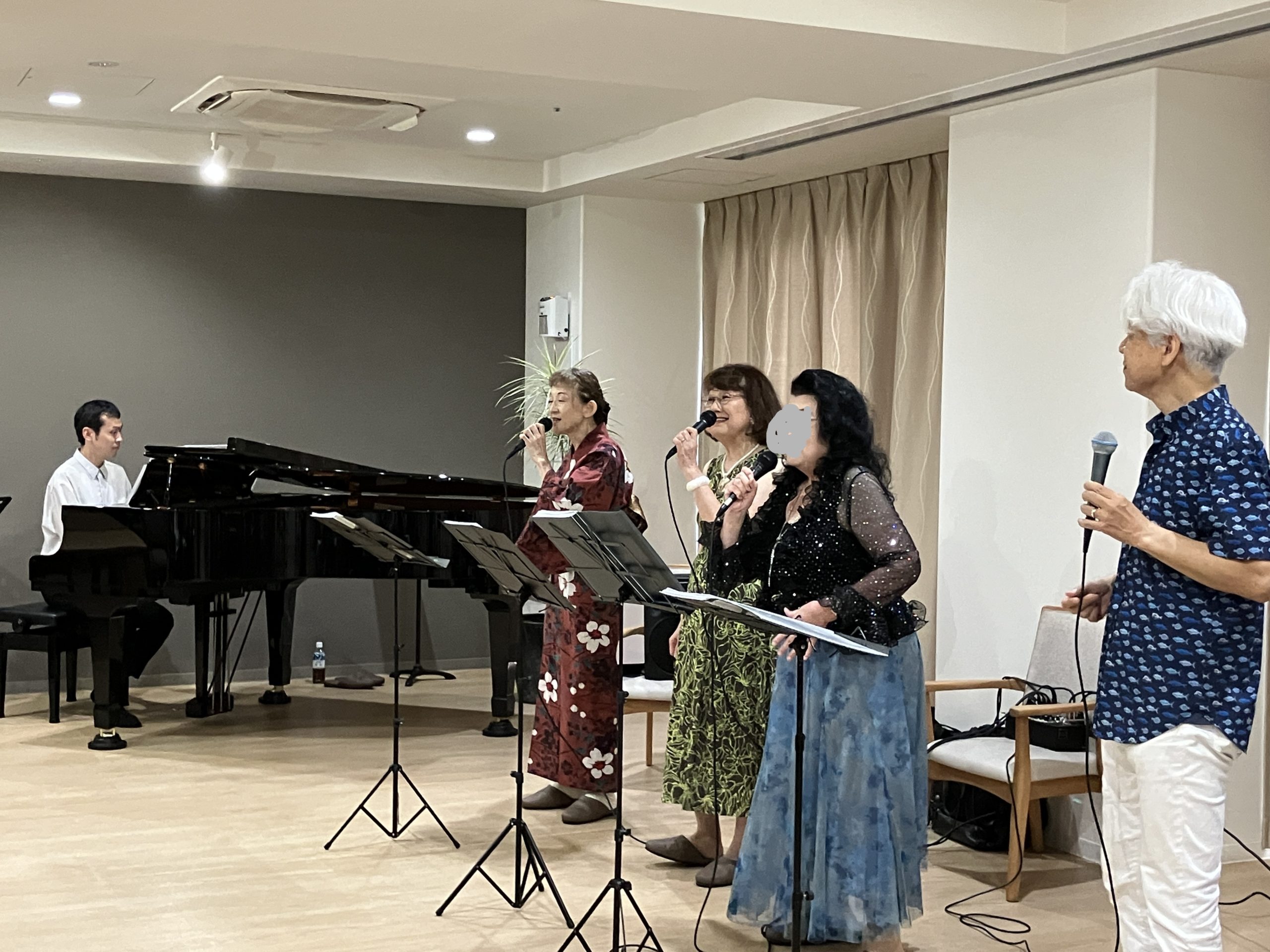今回は混声ジャズコーラスグループ Swing Qが美しいハーモニーをソナーレ杉並上井草の皆さんへお聞かせしました。熟年のコーラス隊と若手ピアニストのユニークな組み合わせで生音楽の良さを伝えようと努力しているグループです。今回は観客の皆さんにとってとても昔懐かしい選曲ができたようでした。