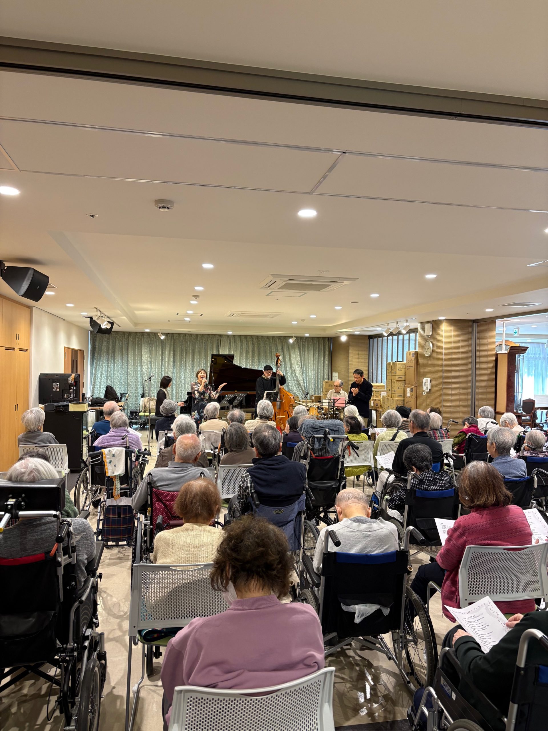 杉並区高井戸西の特別養護老人ホーム「山河」で今年最初のふれあいジャズコンサートを開催させて頂きました。この施設には、食堂とは別に、グランドピアノが置いてある大きな集会ホールがあるのですが、このホールが全部埋まるほど沢山の入居者の皆さんが聴きに来てくれました。今回は女性ボーカルの中村亜海さんとドラムの岡崎章臣さんがはじめてふれあいジャズコンサートに参加してくれたのも嬉しかったです。観客の皆さんには懐かしい映画音楽と哀愁のあるハーモニカ・ジャズをゆっくりと楽しんで頂きました。
